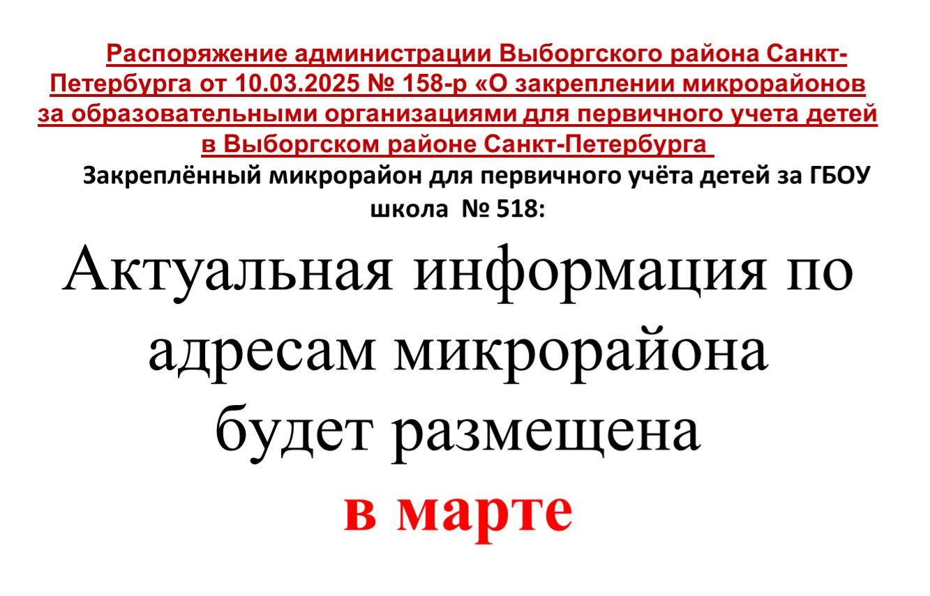 - Распоряжение Администрации Выборгского района Санкт_Петербурга от 10.03.2025 №158-р "О закреплении микрорайонов за образовательными организациями для первичного учета детей в Выборгском районе Санкт-Петербурга"